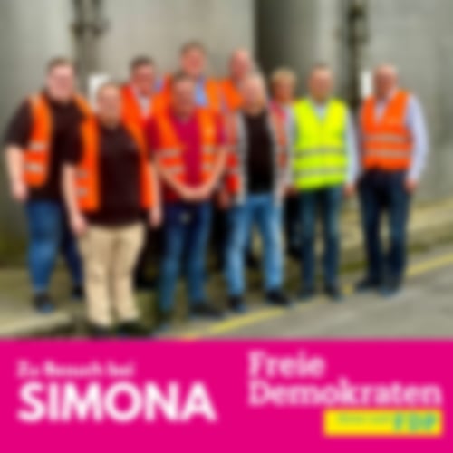 Die Mitglieder der FDP Kirner Land um Vorsitzenden Thomas Bursian, und Stadtbürgermeister Frank Ensminger, mit dem Vorstandsmitglied der Simona (CFO) Michael Schmitz. (2.v.r. in gelber Weste)